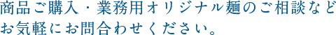 御社オリジナルの麺をご提案・生産いたします。 麺の太さや原料、配分などこだわりの麺をお作りいたします。 また納期・ご予算などにも可能な限りお応えしておりますので、お気軽にご相談くださいませ。